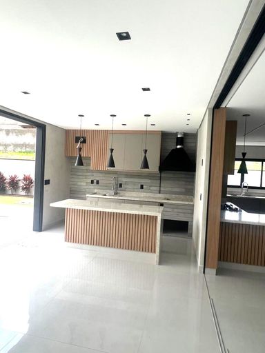 Cozinha ampla integrada ao gourmet separados com porta deslizante de vidro – ambos ricos em móveis planejados – com fogão cooktop e coifa